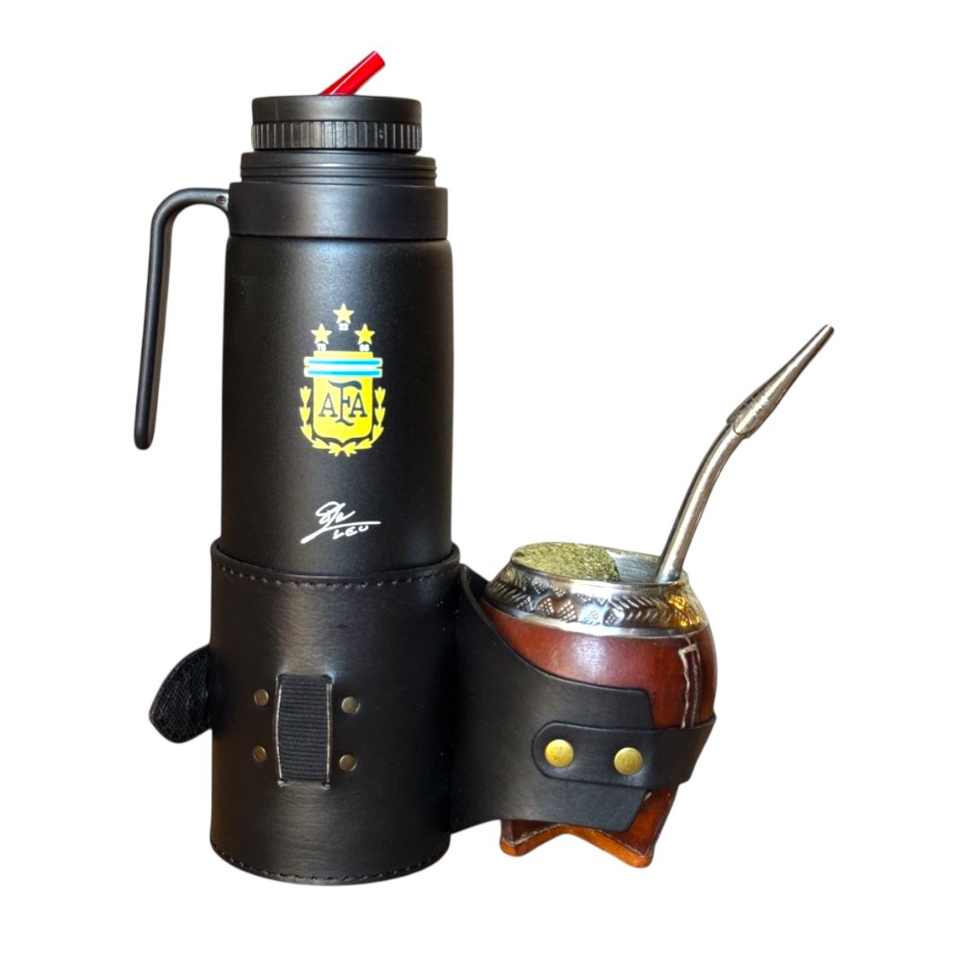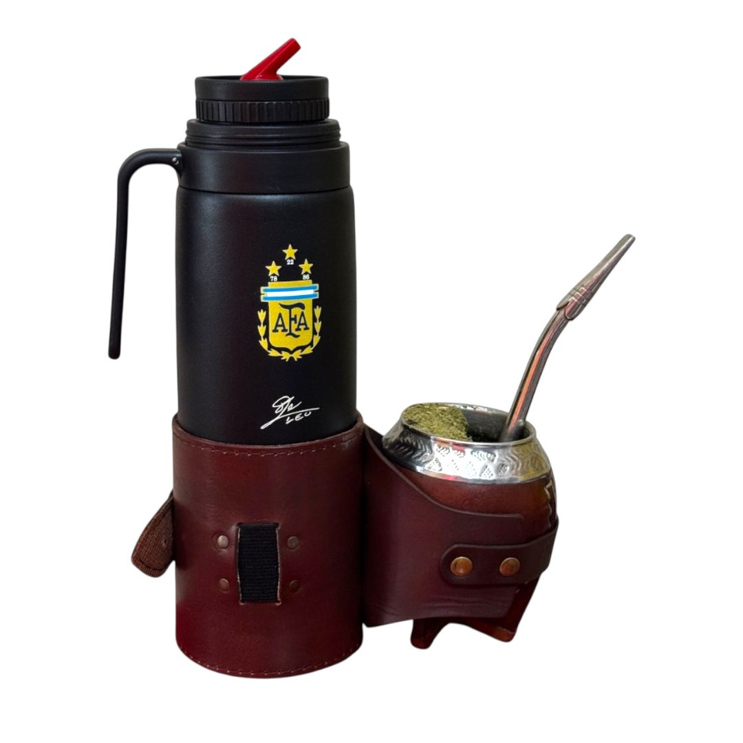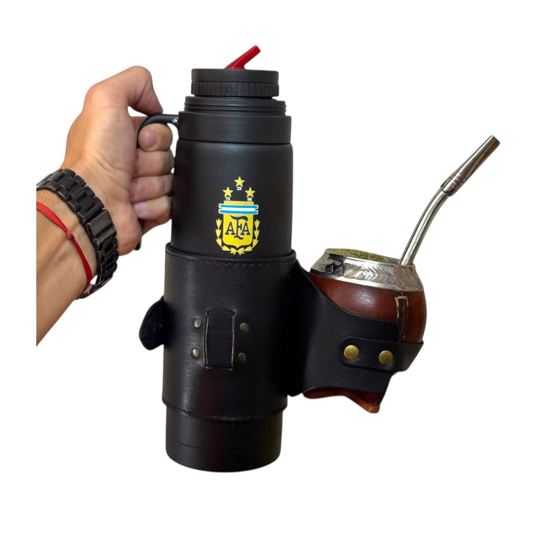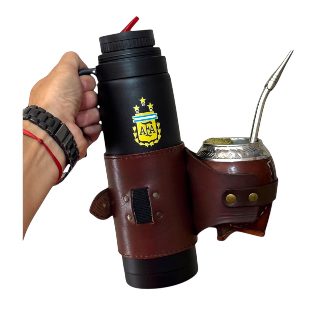 Porta mate y termo fabricado en cuero con elástico ajustable para bombilla.