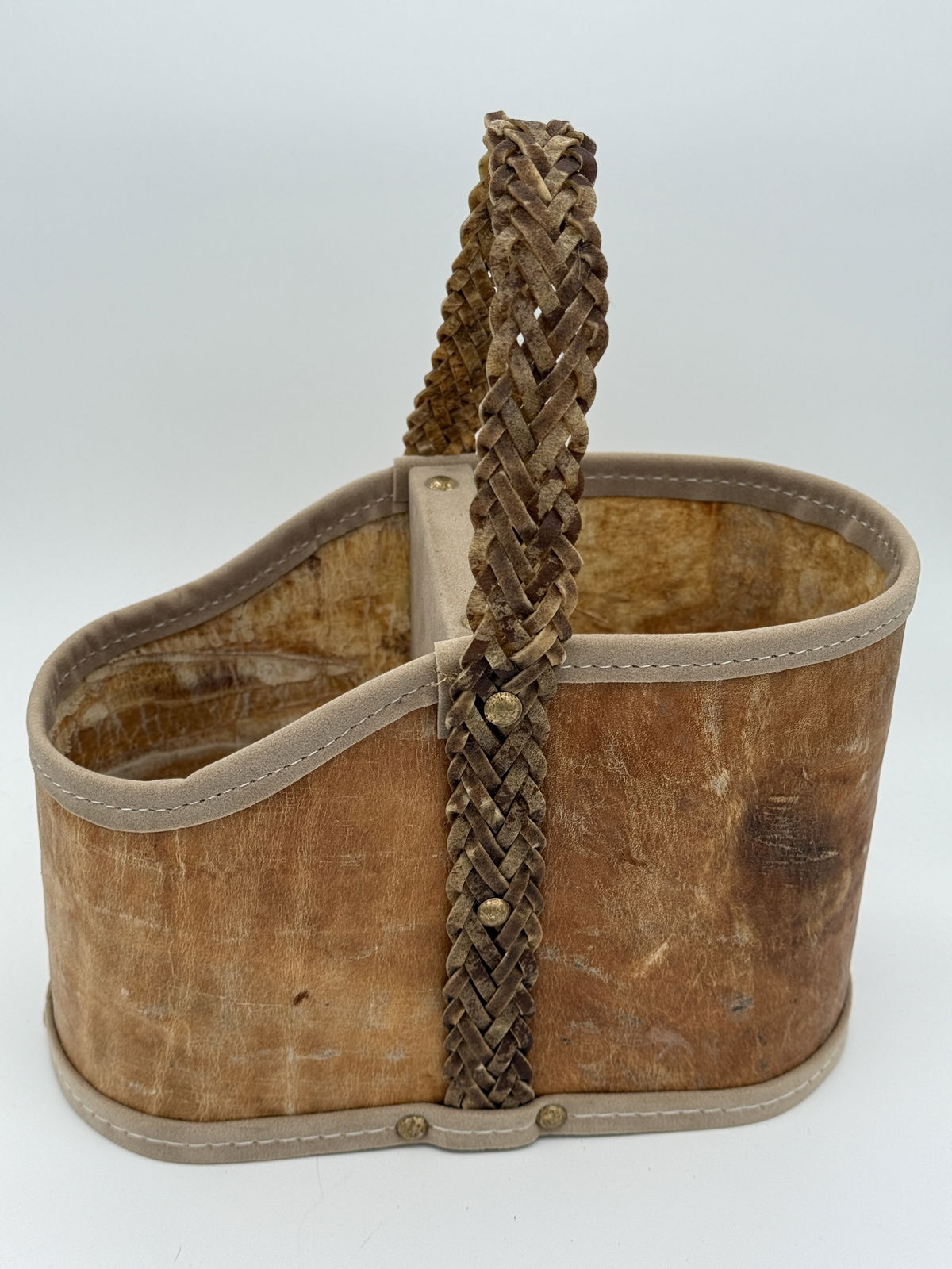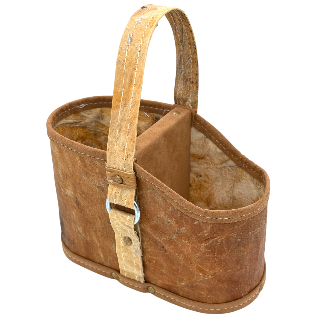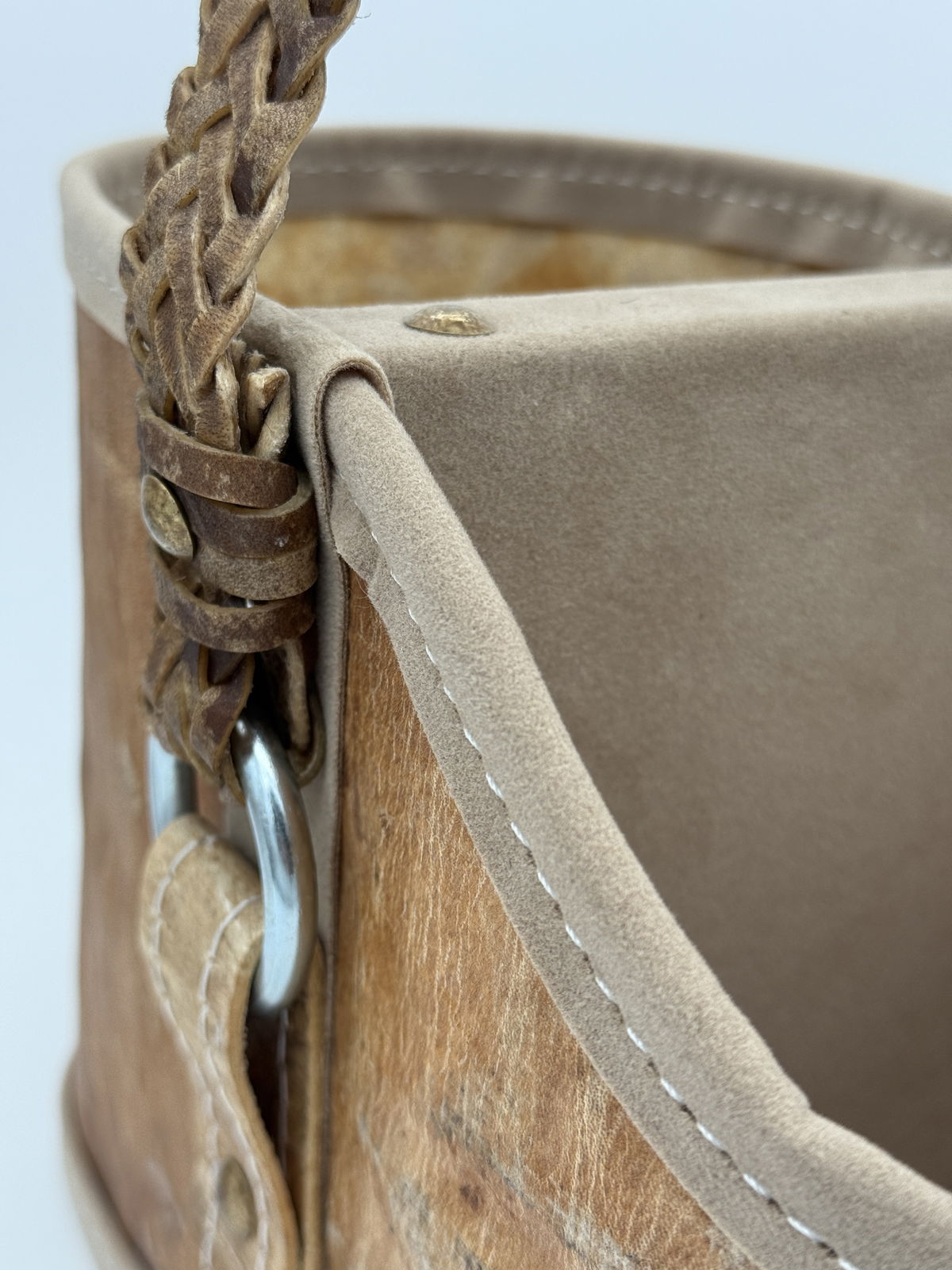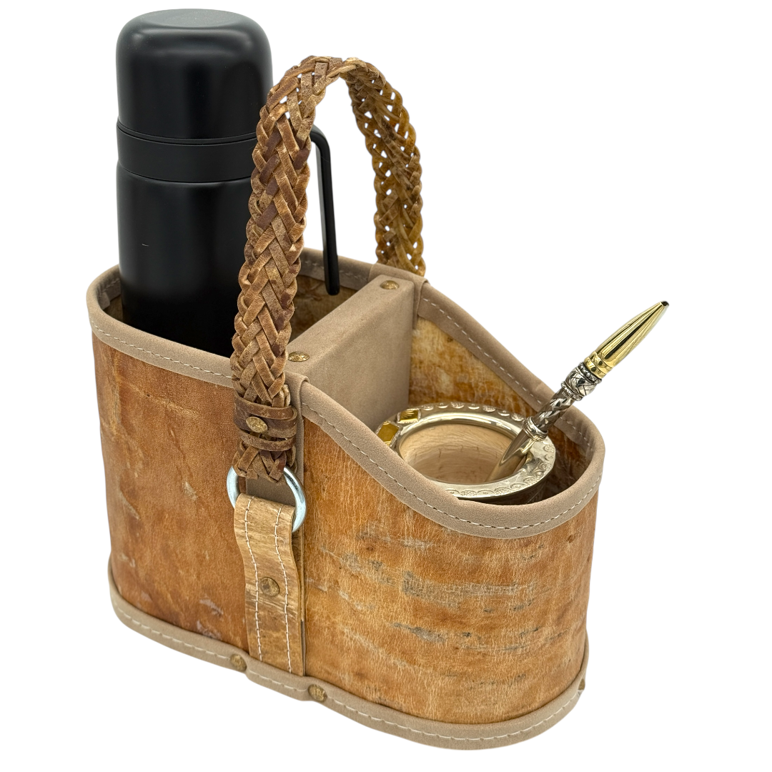 Esta matera de cuero crudo con manija trenzada o Lonja en tiento refleja el equilibrio perfecto entre tradición y calidez.